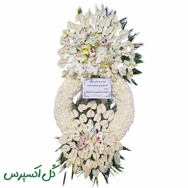 تاج گل ترحیم لاکچری یک طبقه با ترکیب گلهای سفید همچون آنتوریوم، رز، داوودی و ارکیده در این تاج گل، جلوهای از آرامش، احترام و خلوص را به نمایش میگذارد. طراحی مدرن و یکطبقه این تاج، آن را برای مراسمهای رسمی و ارسال پیام تسلیت بسیار مناسب ساخته است. حضور گلهای باکیفیت و تنالیتهی سفید، حس همدلی و همدردی را به زیبایی منتقل میکند و انتخابی شایسته برای ابراز همدردی شماست.