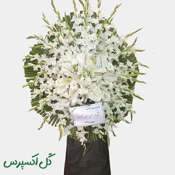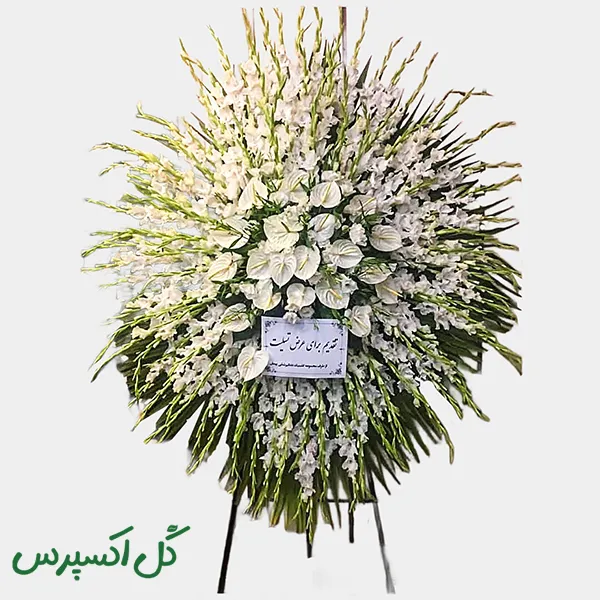 تاج گل اقتصادی ترحیم با گلهای گلایل و آنتوریوم سفید مناسب برای مراسم ختم و عزاداری.