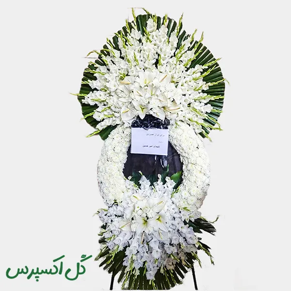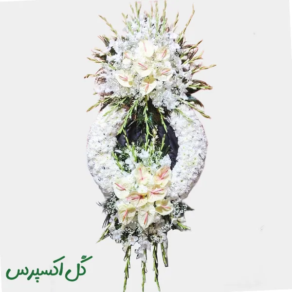 تاج گل مدرن تسلیت داوودی، آنتوریوم و گلایل سفید؛ مناسب ختم با طراحی ساده و بستهبندی زیبا، همراه ارسال رایگان در تهران.