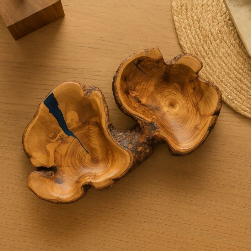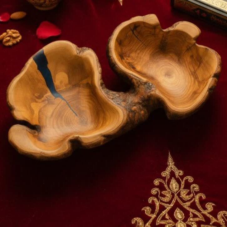 ظرف پذیرایی دو بخشی روستیک از چوب زیتون، دستساز و منحصر به فرد، مناسب سرو پیشغذا و دکور میز با طرح طبیعی و محافظتشده.